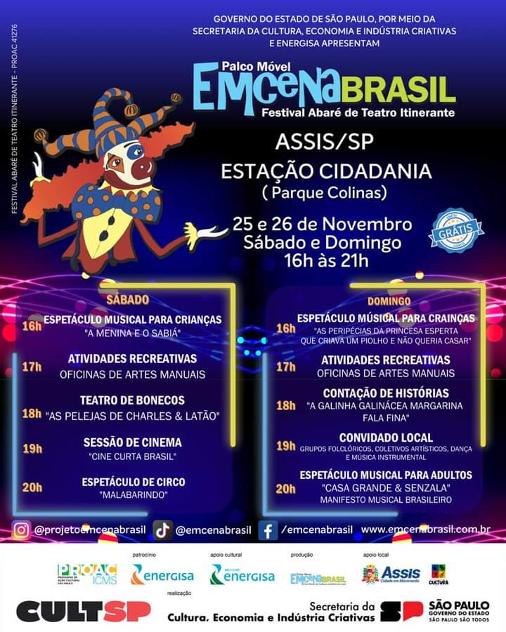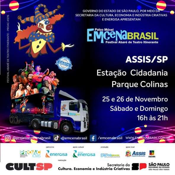 O município de Assis se prepara para receber o Palco Móvel Festival Abaré de Teatro nos dias 25 e 26 de novembro de 2023. O projeto, realizado pela Companhia Abareteatro, em parceria com o Proac ICMS – Governo do Estado de São Paulo, Secretaria de Cultura, Economia e Indústria Criativas, Emcena Brasil, e com o patrocínio do Grupo Energisa, promete dois dias de atividades culturais diversificadas.