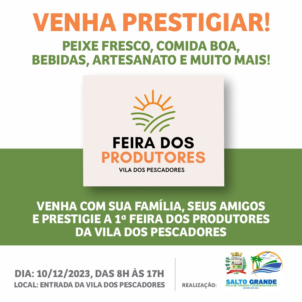 Atenção moradores da cidade de Salto Grande, neste domingo acontecerá a primeira feira dos produtores da Vila dos Pescadores. Venham conferir a variedade de delícias preparadas com muito carinho para vocês. Produtos orgânicos, salgados, compotas e muito mais!