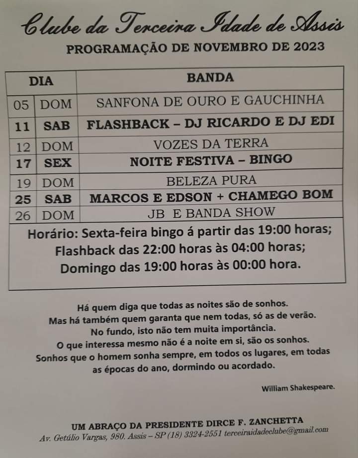 Agenda de eventos do Clube da Terceira Idade de Assis SP. Novembro 2023