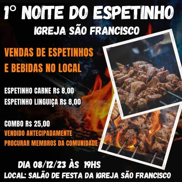 Noite do Espetinho em Cândido Mota SP dia 8 de Dezembro 2023 às 19hs. No Salão de Festas da Igreja São Francisco.